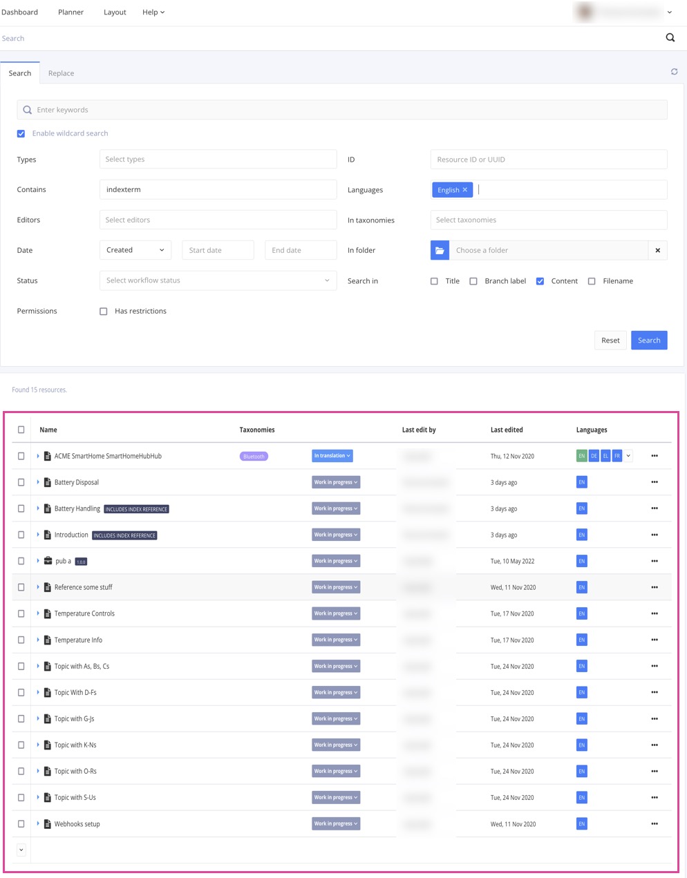 Alle Topics, die den Suchkriterien entsprechen, werden unterhalb des Suchbereichs angezeigt.