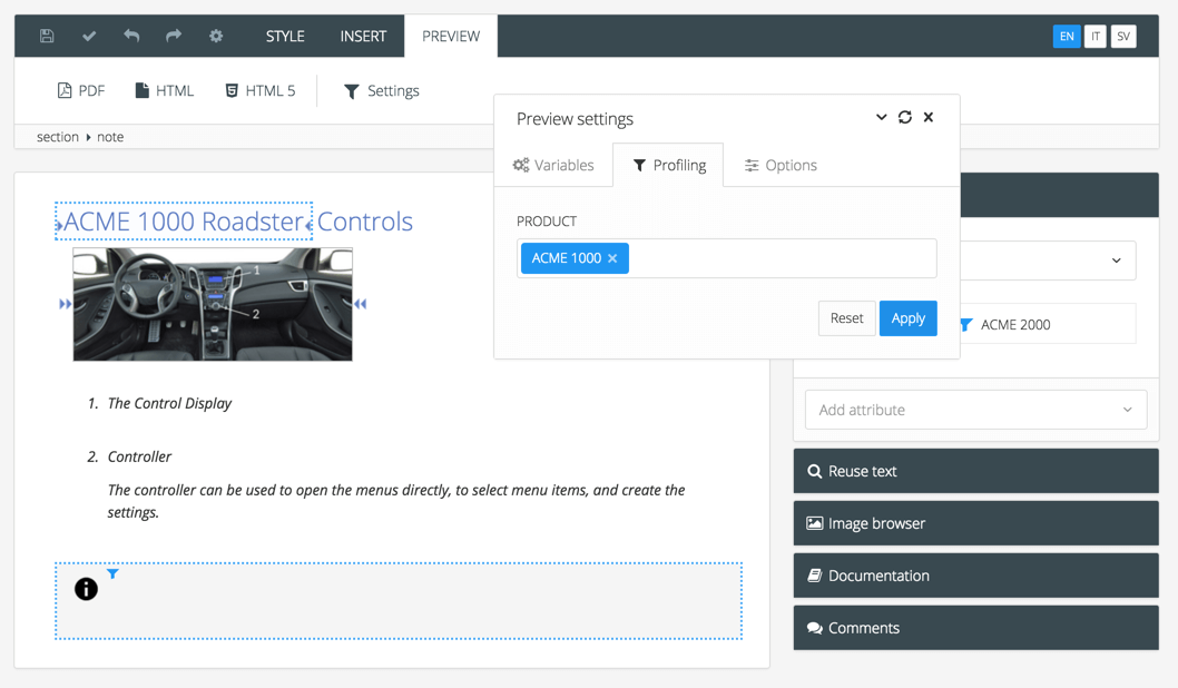 When using variables and / or filters, you can configure settings to view specific variants of your content via the Profiling tab. You can reach the Profiling tab from Editor, Review View and Translation View. The filters you set in the Profiling tab will also apply when you preview content in PDF, HTML5 or HTML from within the editor. This is a very useful way to see how the profiled content will actually come out.